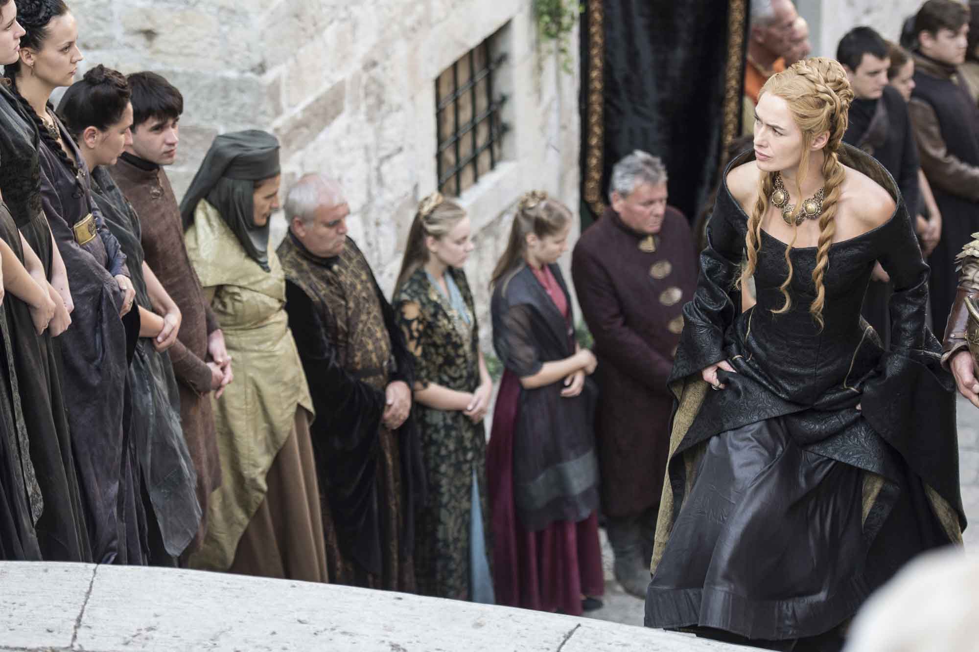 Jaime and Cersei Lannister attend to their late father Tywin under the gaze of nobility, the King, and the Gods.